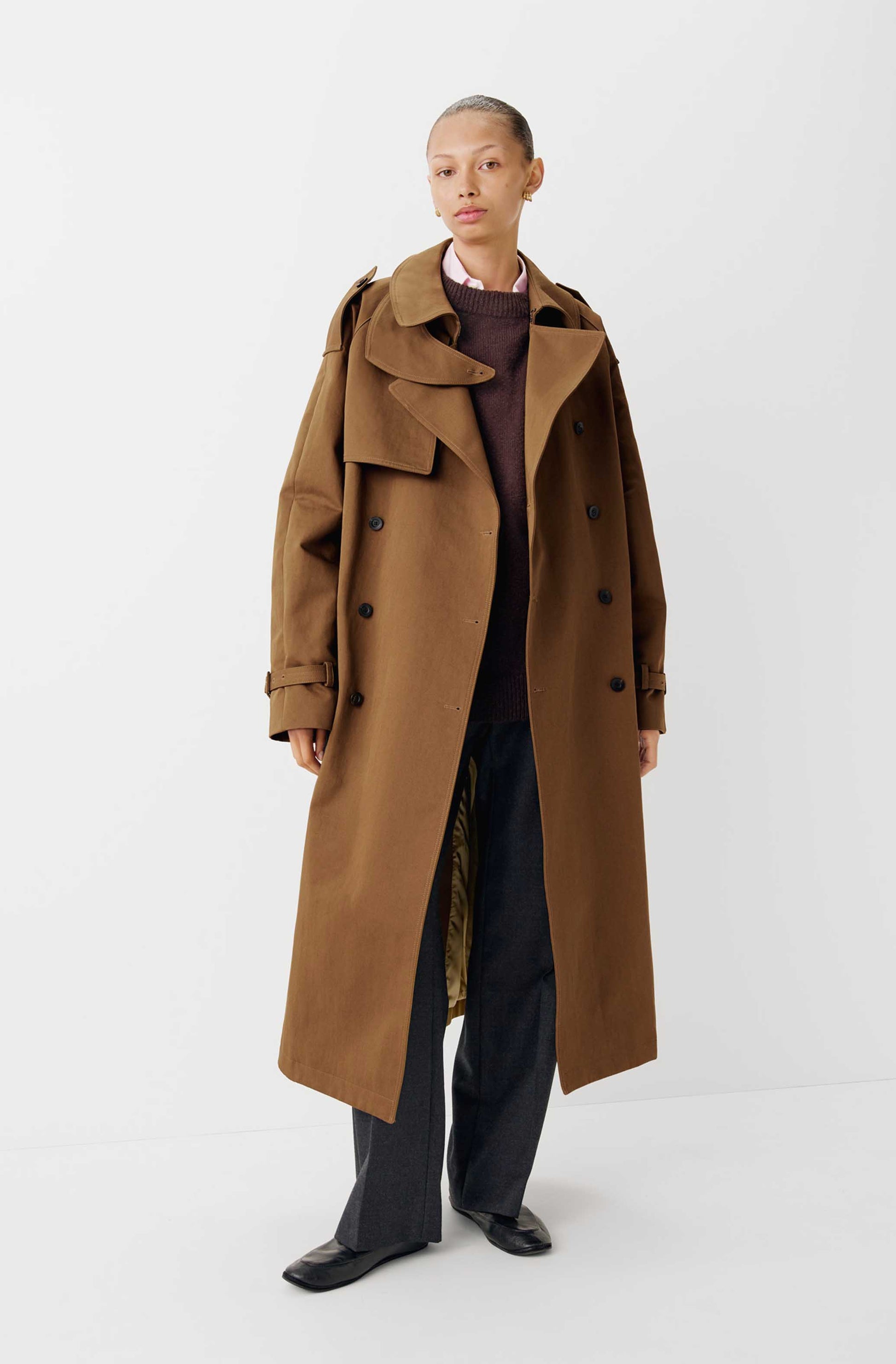Made in England from Italian bonded cotton with a silk lining, The Bolton Trench Coat features an oversized silhouette with raglan sleeves. Finished with cuff belts, waist tie, and an exaggerated collar with throat guard, it balances structure with ease.