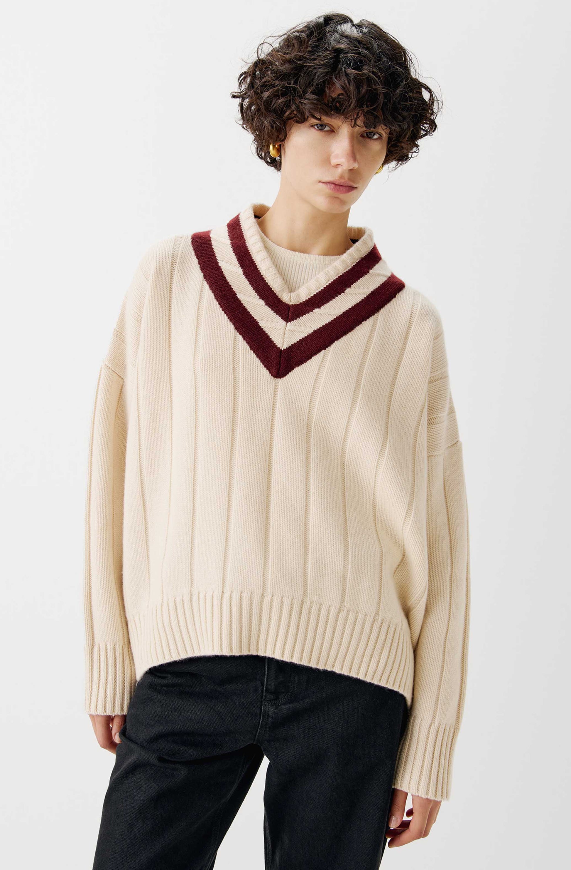- Striped neck trim with ribbed hem and cuffs