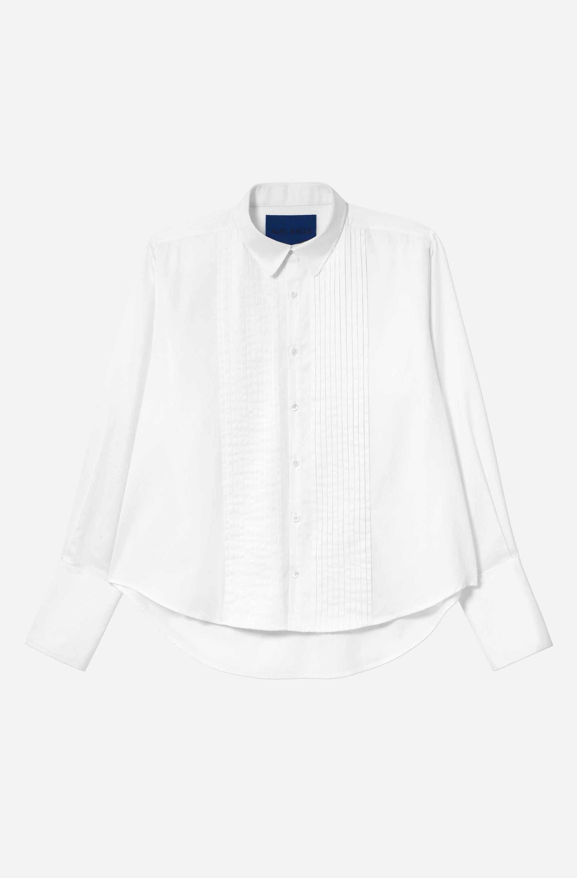 A formal yet relaxed dress shirt cut from Italian cotton twill. Hand-pleated front panels add structure and elevate the detail, while the boxy silhouette, dropped back hem, and double cuffs bring ease to the design.