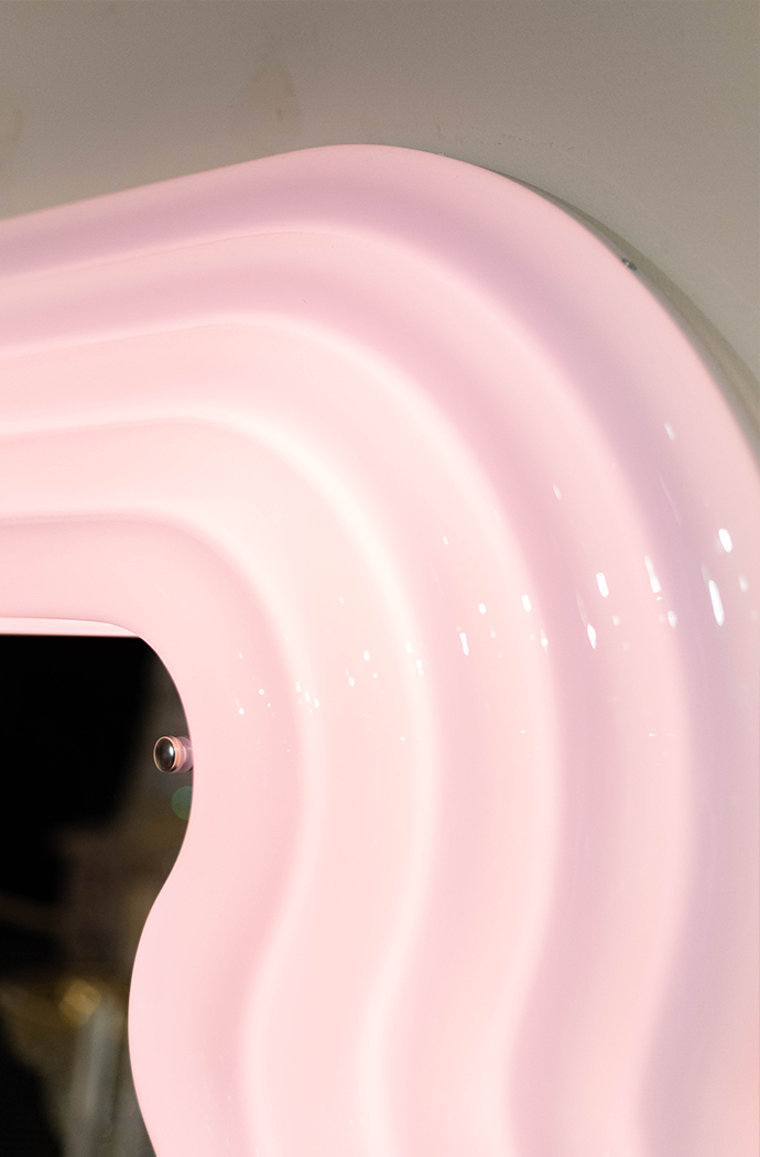 Featuring a stylised opaline resin frame concealing neon tubes, the frame is white when the light is off and turns pink when switched on, evoking a spectral sensation.
