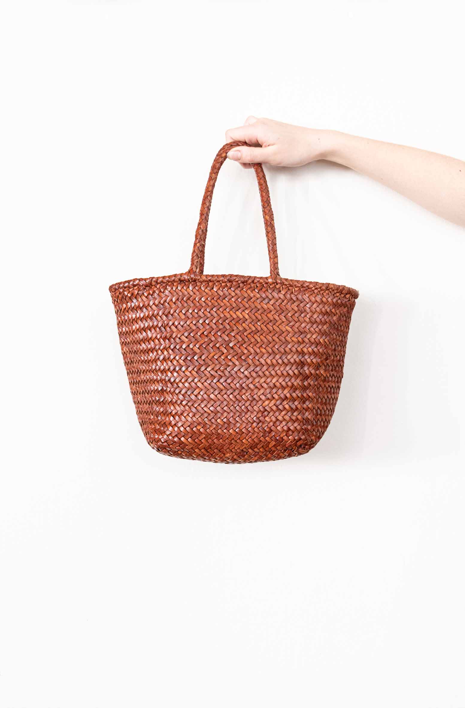 The Grace Basket Small is a more rounded version of the Triple Jump bags. Unlined and open-top, the soft, buffalo calf leather basket features elegant braided top handles and a diagonal weave that keeps its form.