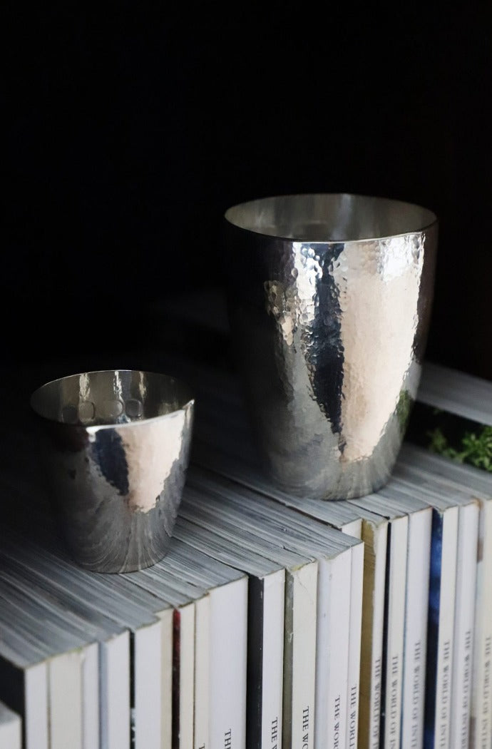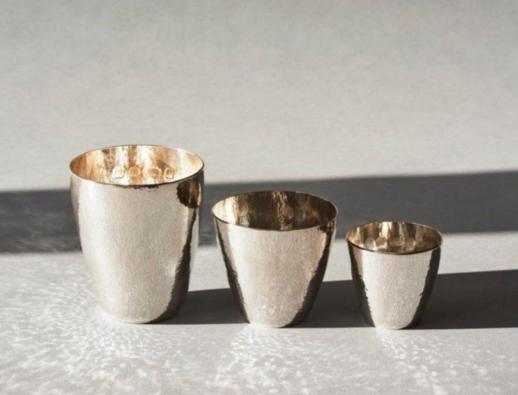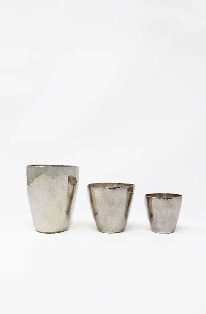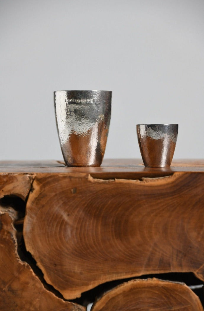 Hand-crafted beakers made from Britannia silver and hand-hammered in Kathmandu.