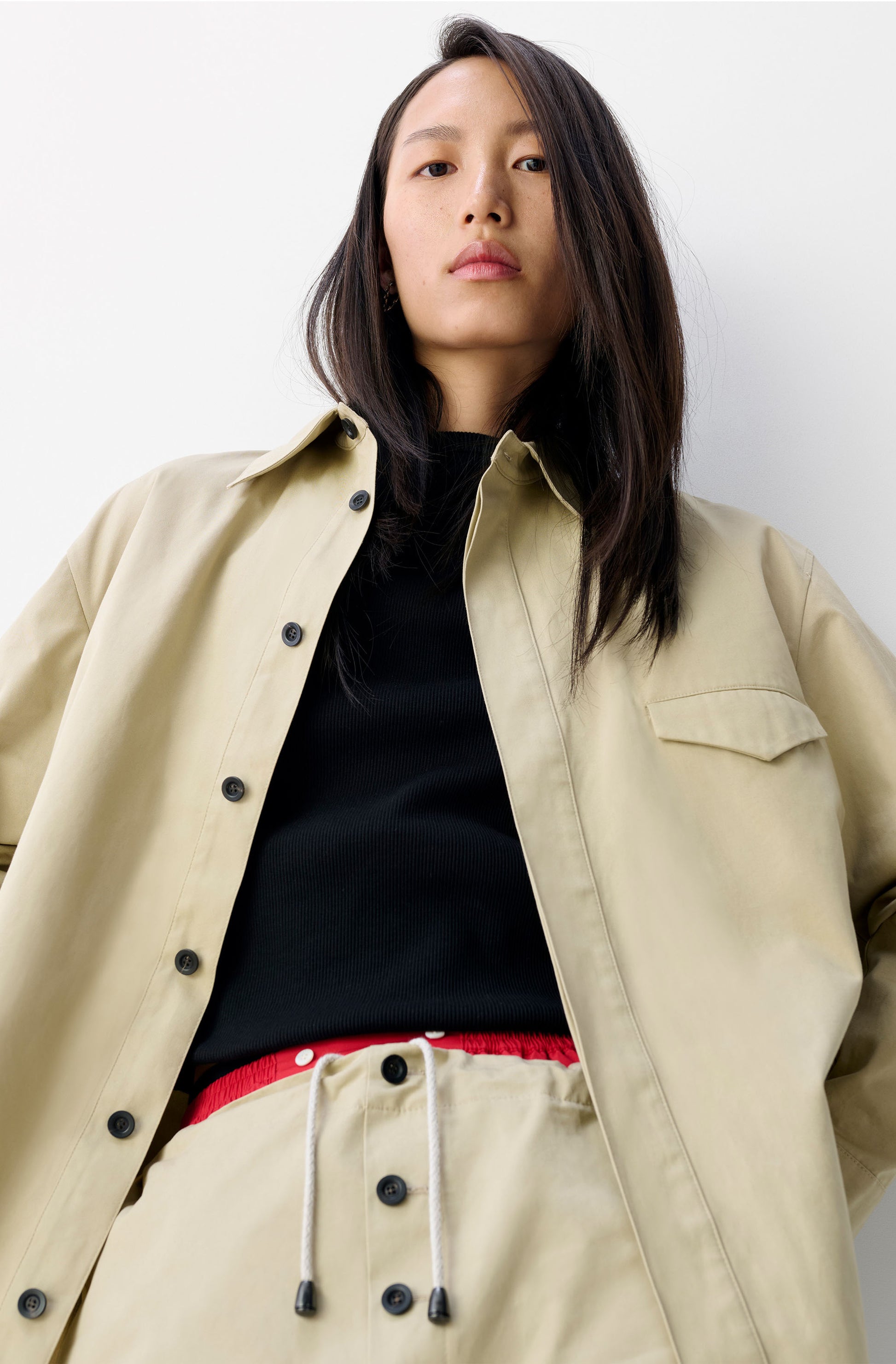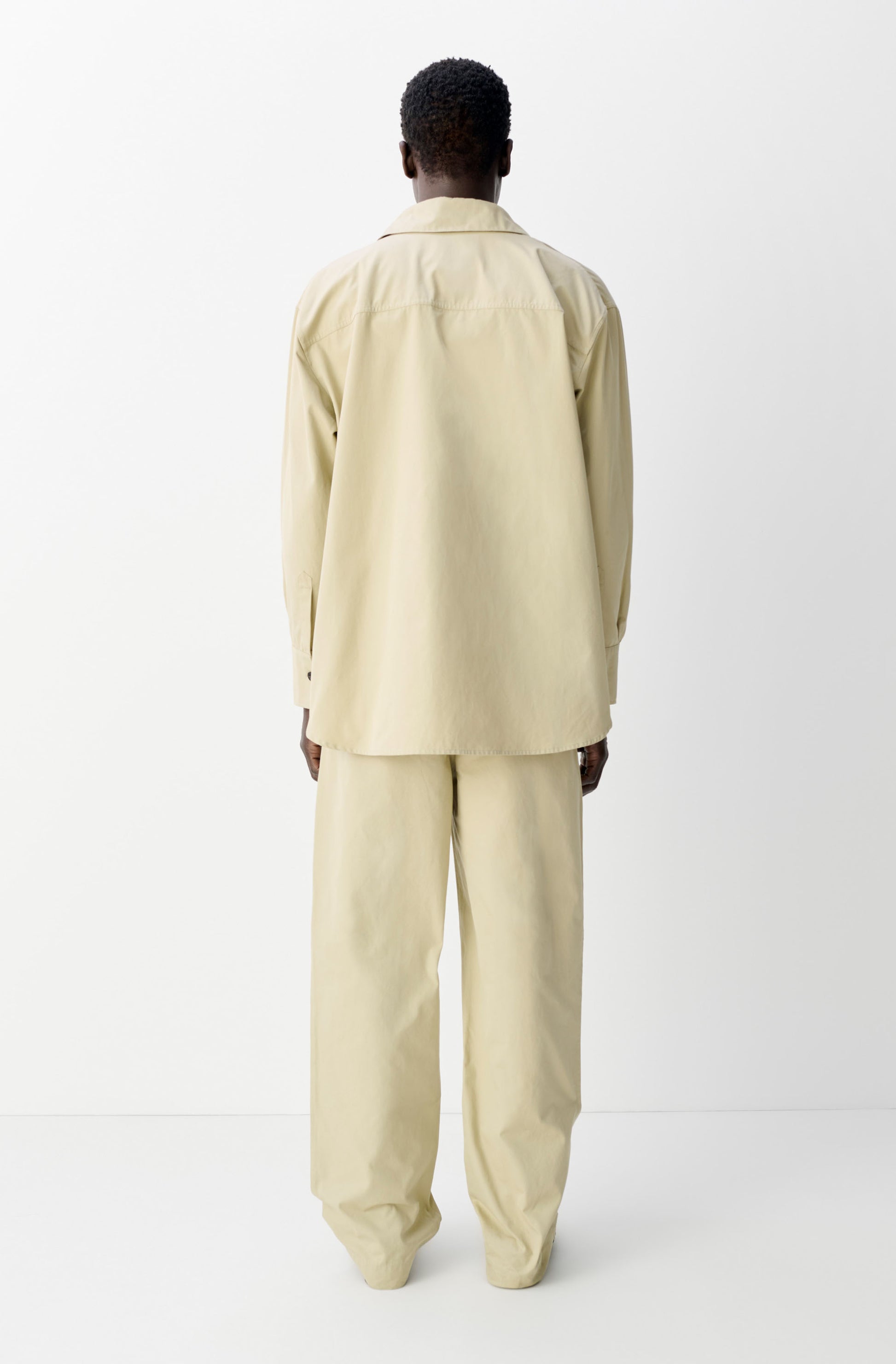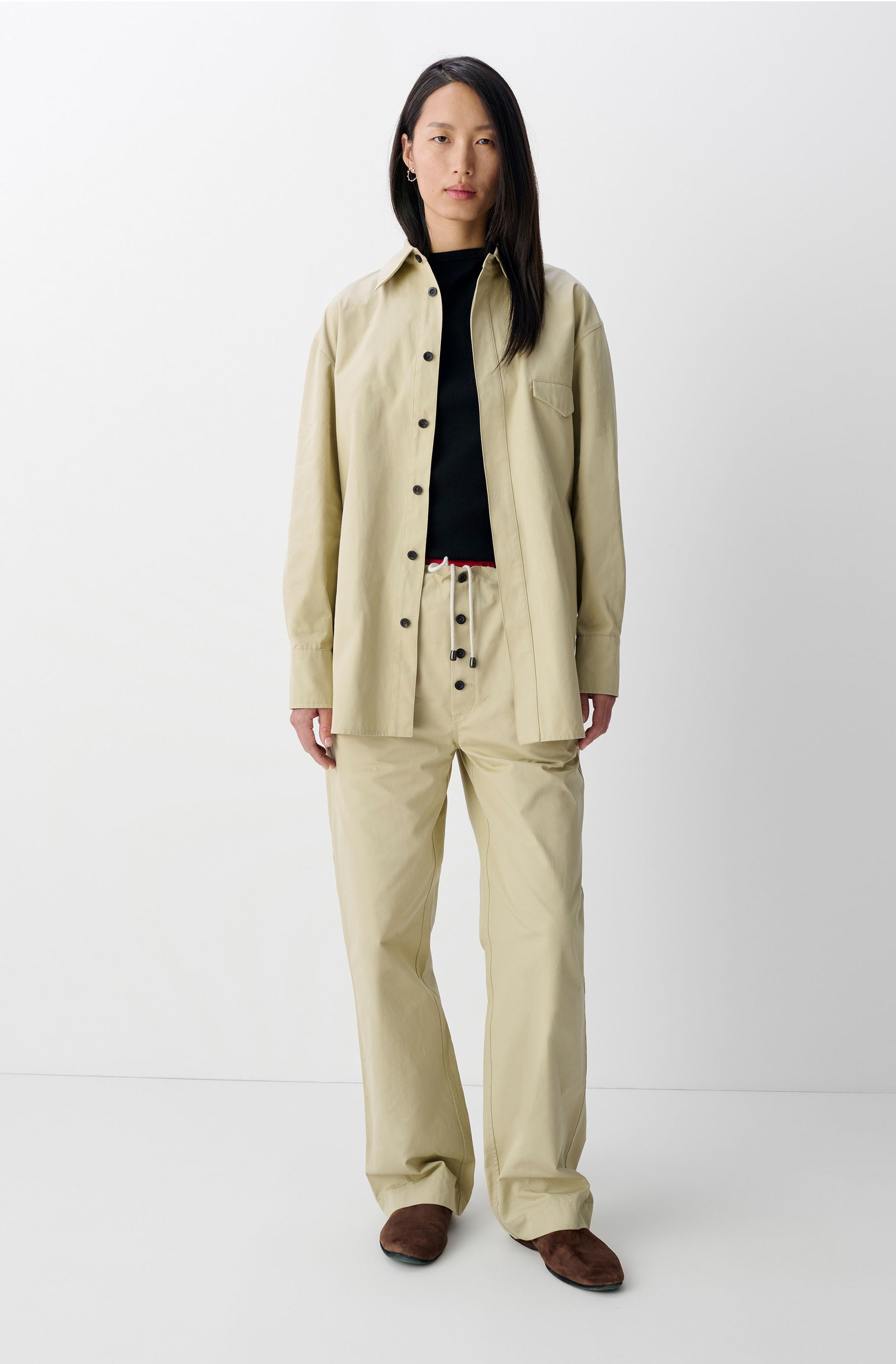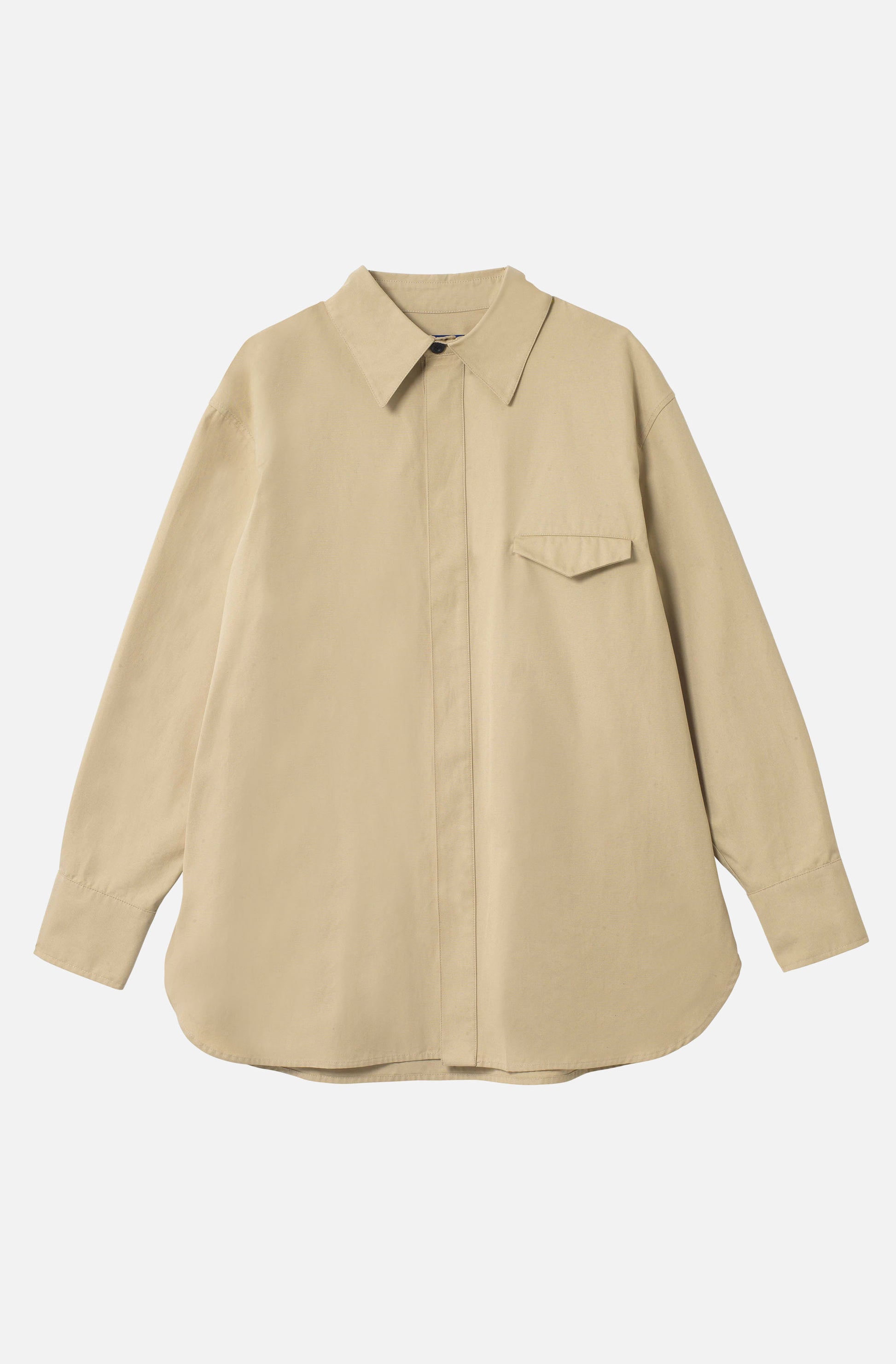 A modern staple with a tailored edge. The Arundel Chino Shirt is cut from crisp Italian mid-weight cotton shirting, designed with dropped shoulders and an oversized silhouette. Finished with horn buttons and unisex sizing for effortless versatility.