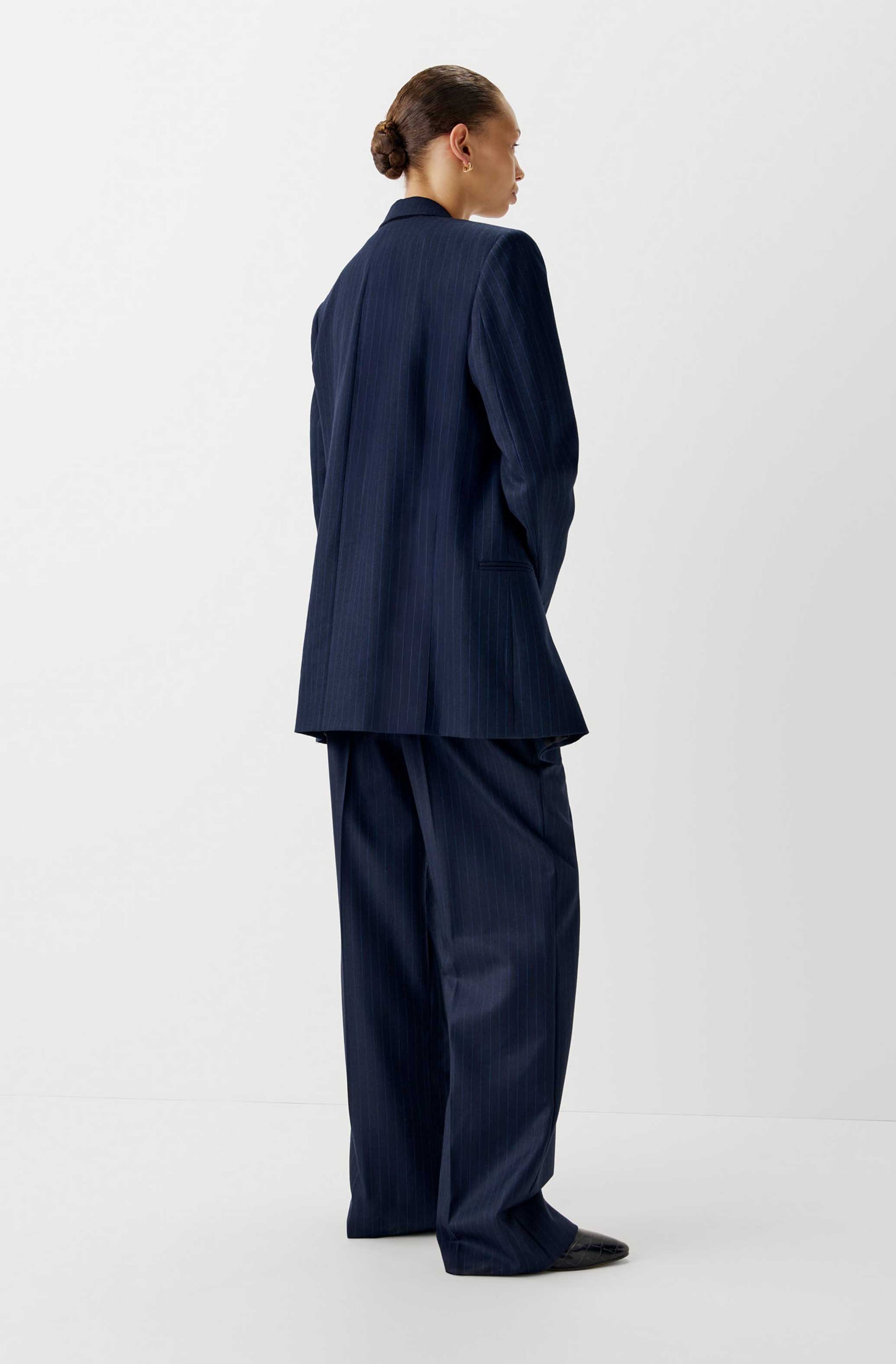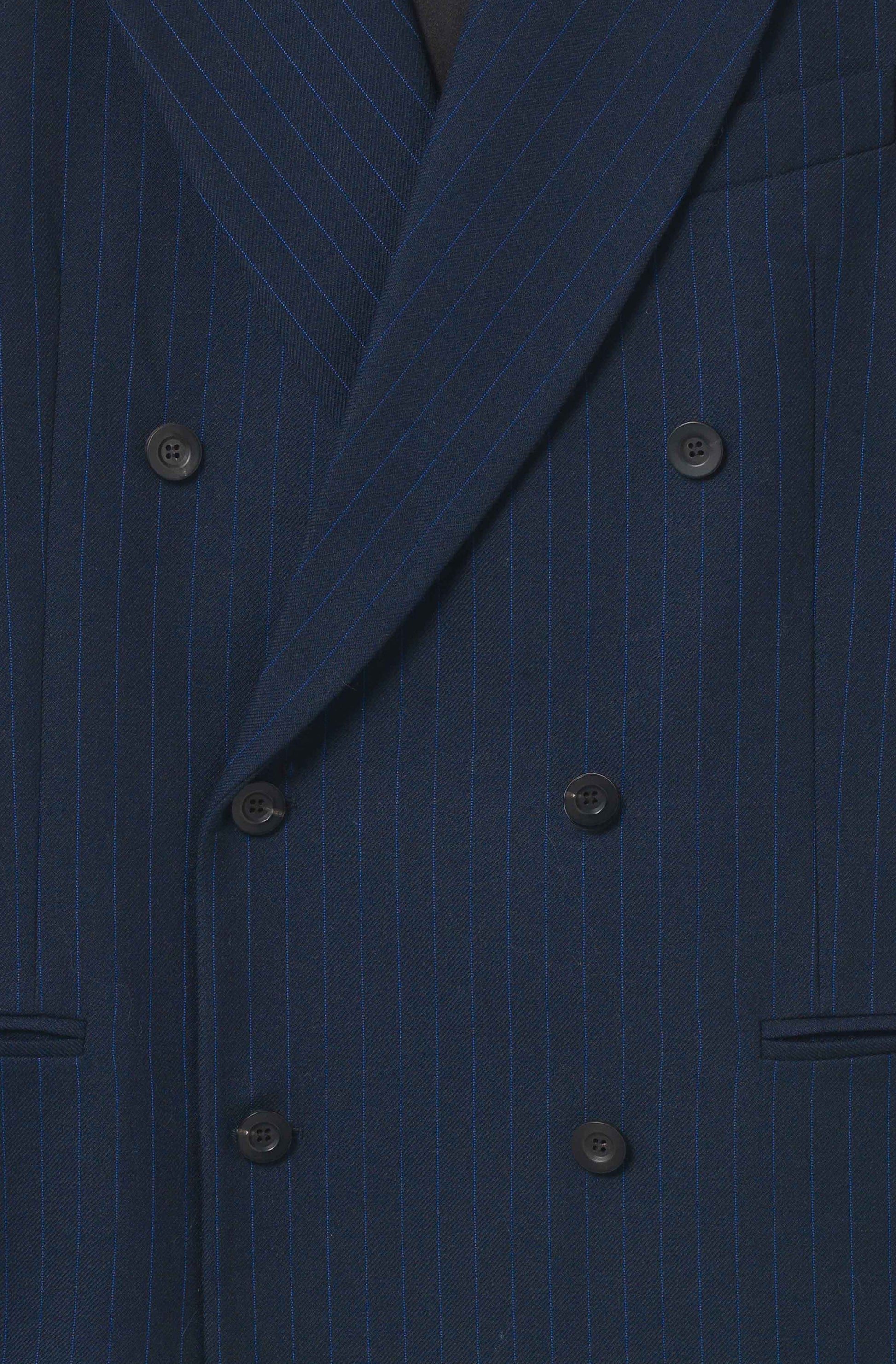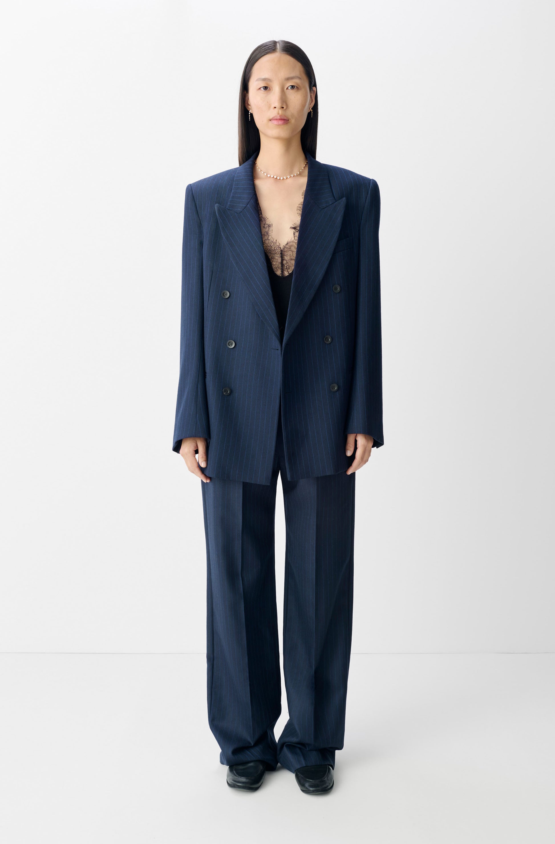 The Dean Suit Jacket is an oversized structured double-breasted style, tailored from British heritage wool in a navy pinstripe with a striking electric blue accent. Designed with a boxy fit, firm shoulders, and fully lined in silk satin for a clean finish.