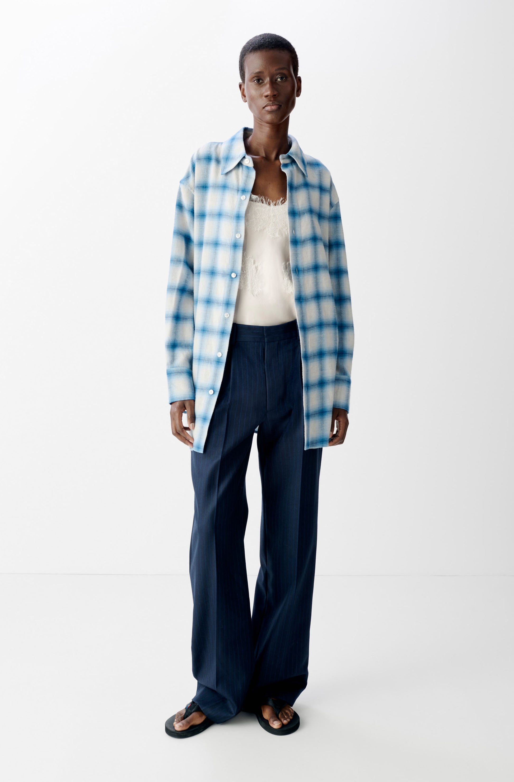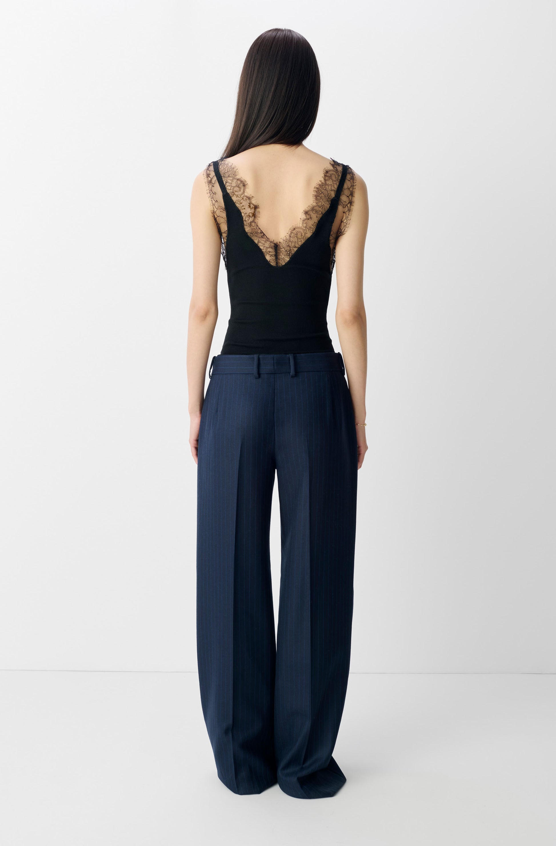 Tailored from British heritage wool suiting with a distinctive electric blue pinstripe, The Dean Trousers are cut with a pleated front and pressed centre leg for a sharp silhouette. Designed to sit on the hips with a relaxed fit. Finished with slant pockets and a hook-and-bar zip fastening.