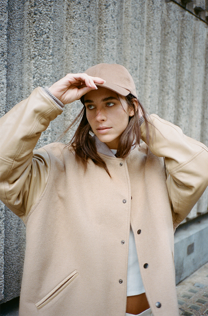 The Varsity Jacket features an oversized silhouette, with two front pockets, silk quilted lining, and ribbing detail around the neck and cuffs. Made from 100% camel hair with contrasting lambskin leather sleeves.
